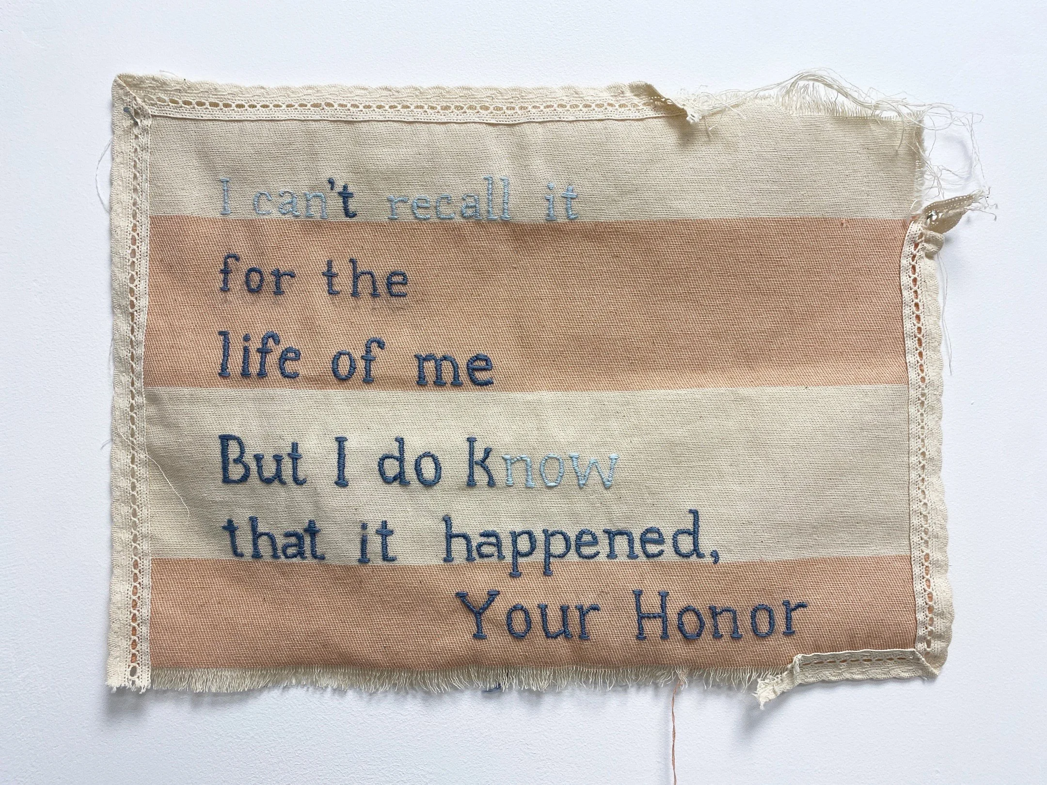 I Can Recall It Now, hand embroidery on scrap fabric with crochet trim, 32x46 cm